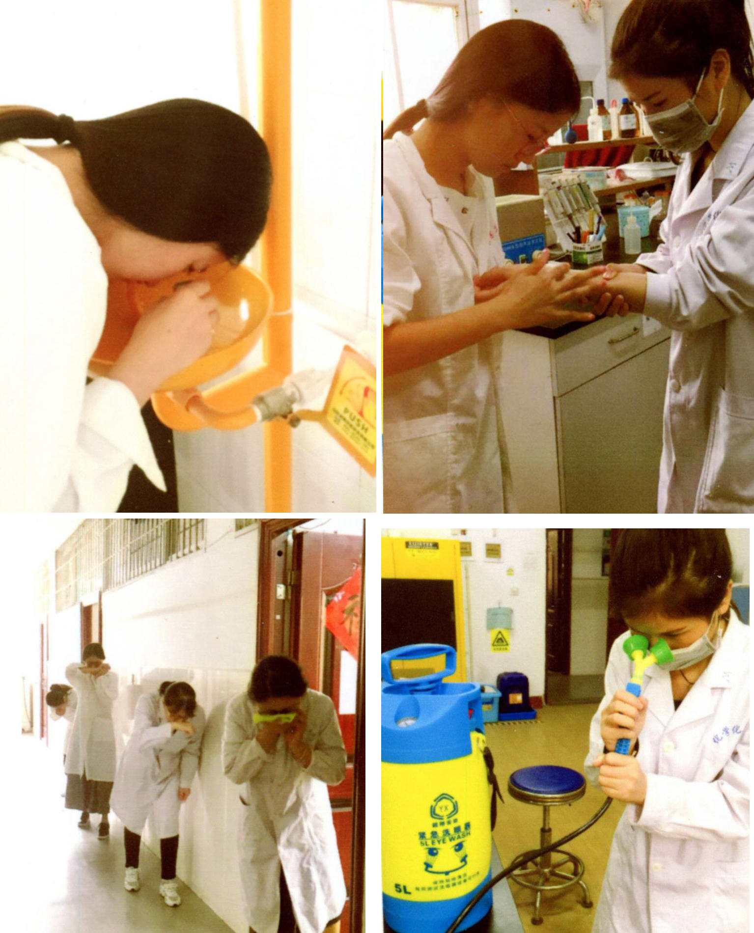 下午17时整,老师在实验室模拟了酒精灯倾倒引燃实验台着火、强酸喷溅到员工眼睛、强碱喷洒到员工手臂三项事故。老师宣布员工停止实验,组织员工尽快处理事故。一位教师指导3位员工迅速收集多块抹布,浸湿后覆盖桌面;一位教师指导员工正确使用紧急洗眼器冲洗眼睛;实验室主任指导员工迅速使用紧急喷淋器冲洗手臂;公司领导和教学中心安全管理员指导其他员工有序地撤离实验室,从安全出口迅速到大楼外空地集合。