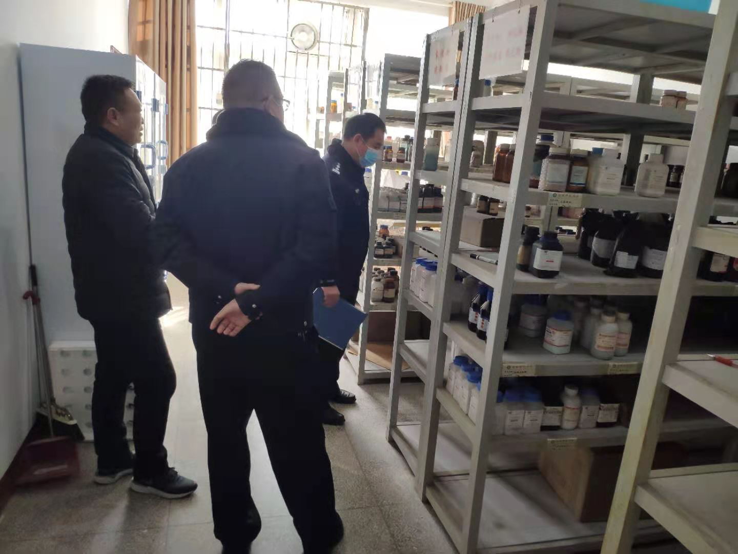 2021年1月18日,信阳市公安局老城派出所民警对太阳集团tyc151cc开展危化品安全检查和指导工作。太阳集团tyc151cc经理井强山、实验室主任于永生及其他实验室安全负责人陪同检查。