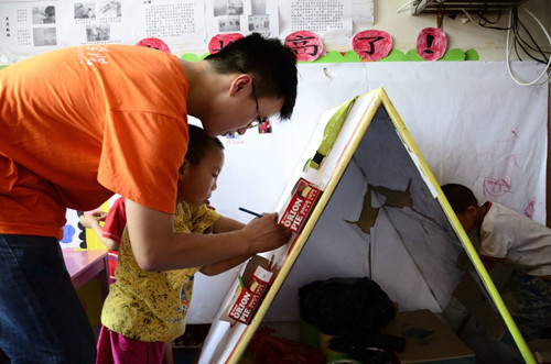 历经长途跋涉,小分队员们终于来到了信阳市儿童福利院。他们个个身着鲜艳的橘色志愿服,手提精心为孩子们准备的各种礼物,远远望去,给人一种莫名的感动!刚进福利院大门,就望见孩子们的各种活动设施:滑梯、蹦床等,给人一种欣慰之感!可当小分队员们在引导员的引领下来到孩子们的课堂时,小分队员们心中感到一阵阵心酸!孩子们都蜂拥而上,一把抱住小分队员,长久的缺乏关爱,让孩子们有了一点点自闭,使得小分队员们疼惜不已,一个个都尽自己最大的努力在最有限的时间里将自己最多的关爱留给孩子们。孩子们在小分队员的感化下虽有哭有闹,却更添了些许活泼,使人怜爱不已!