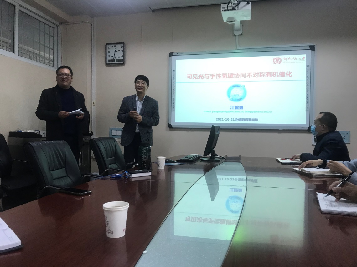 10月21日,应太阳集团tyc151cc邀请,河南师范大学江智勇教授在化学楼210会议室作了题为“可见光与手性氢键协同不对称有机催化”的学术报告,报告会由副经理曹俊涛主持,太阳集团tyc151cc部分青年教师和研究生参加了报告会。