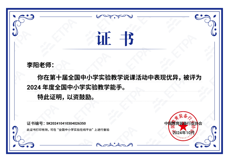 在本次活动中,李阳老师的选题为《原电池实验设计与探究》,联系生活实际利用自制教具,结合具体的化学实验从家庭实验、公司课堂、社团活动、社会实践多个角度出发,让员工充分感受化学的魅力。李阳老师在比赛过程中,展示了较强的化学教学基本功,获得了评委专家的一致认可与好评。经过区、市、省赛的层层选拔,荣获2024年度实验教学技能大赛金奖(全省仅7人),2024年度河南省教育系统优质课一等奖,并成功入围教育部第十届全国实验教学说课评比活动(信阳市仅1人)。11月8日,全国中小学实验在线平台公布2024年度全国中小学实验教学能手,李阳老师成功入选。