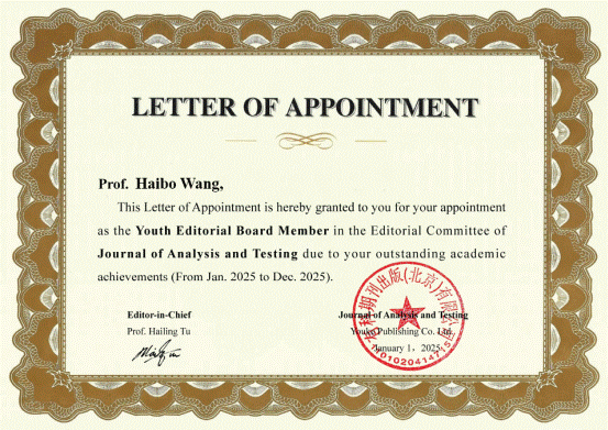 近日,《Journal of Analysis and Testing》期刊公布了2025年新增青年编委会成员名单。公司太阳集团tyc151cc王海波教授受邀担任该期刊青年编委。