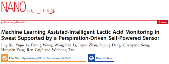 近日,公司许婧博士课题组在柔性可穿戴传感器研究领域取得了新进展,相关成果以“Machine Learning Assisted-Intelligent Lactic Acid Monitoring in Sweat Supported by a Perspiration-Driven Self-Powered Sensor.”为题,在国际知名期刊《Nano Letters》上发表。这项研究开发的智能汗液乳酸浓度监测传感器,通过合成乳酸氧化酶和丙酮酸氧化酶修饰的镍掺杂的金属有机框架(Ni-ZIF-8@LOx&POx)作为生物催化剂,以激光诱导石墨烯作为柔性电极材料,构建了一种高性能的酶生物燃料电池。该酶生物燃料电池结合微流道、无线传输元件和机器学习算法,实现了对汗液中乳酸的高灵敏度、高选择性的实时监测。该传感器不仅具有优异的性能指标,展示出其在个性化健康管理中的潜在应用。