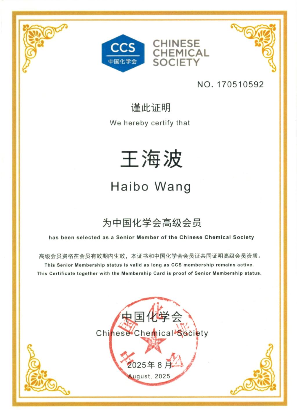 近日,中国化学会公布了新晋升为高级会员名单。公司太阳集团tyc151cc王海波教授成功晋升成为高级会员。
