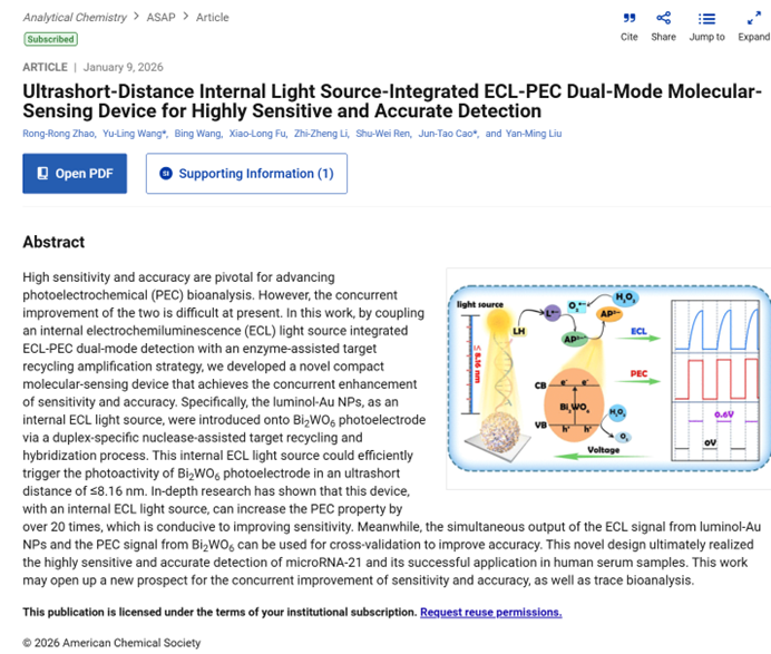 近日,公司刘彦明教授、曹俊涛教授课题组在分析化学国际顶级期刊Analytical Chemistry上发表了题为“Ultrashort-Distance Internal Light Source-Integrated ECL-PEC Dual-Modem Molecular-Sensing Device for Highly Sensitive and Accurate Detection”(DOI:10.1021/acs.analchem.5c06089)的最新研究成果。公司2023级硕士研究生赵容榕为论文第一作者,曹俊涛教授和王玉玲博士为通讯作者,公司为第一单位。