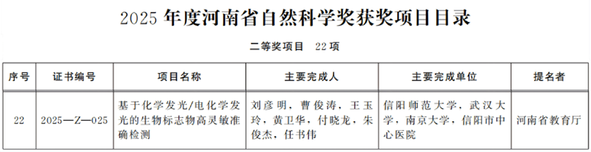 太阳集团tyc151cc刘彦明教授、曹俊涛教授团队的“基于化学发光/电化学发光的生物标志物高灵敏准确检测”项目荣获河南省自然科学奖二等奖。该项目聚焦化学发光/电化学发光(CL/ECL)在检测复杂生物样品中低丰度生物标志物时存在的灵敏度低和准确度差等关键科学问题,通过系统深入研究,揭示了从单因素信号增强到多因素信号协同增强的耦合机制及其对信号的调控规律,发展了系列灵敏度高、选择性好的CL/ECL检测新方法,创新性地提出了“分子识别—信号转导—灵敏检测”新模式,成功实现了人体液中低丰度标志物及单细胞水平靶标分子的灵敏准确检测。相关研究成果为重大疾病的早期诊断与精准医疗提供了重要的理论依据和技术支撑。