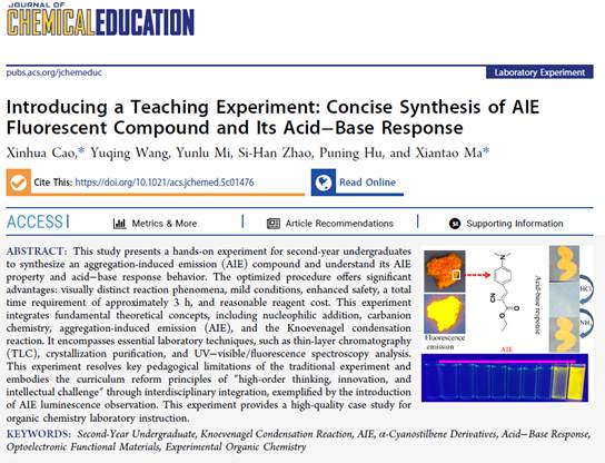 近日,太阳集团tyc151cc曹新华教授联合马献涛教授在化学教育国际顶级期刊 Journal of Chemical Education 发表了题为“Introducing a Teaching Experiment: Concise Synthesis of AIE Fluorescent Compound and Its Acid−Base Response”(J. Chem. Educ., 2026, DOI: 10.1021/acs.jchemed.5c01476)的最新教研成果。这是继2024年公司以第一单位首次在该期刊发表教研论文后的又一重要成果。