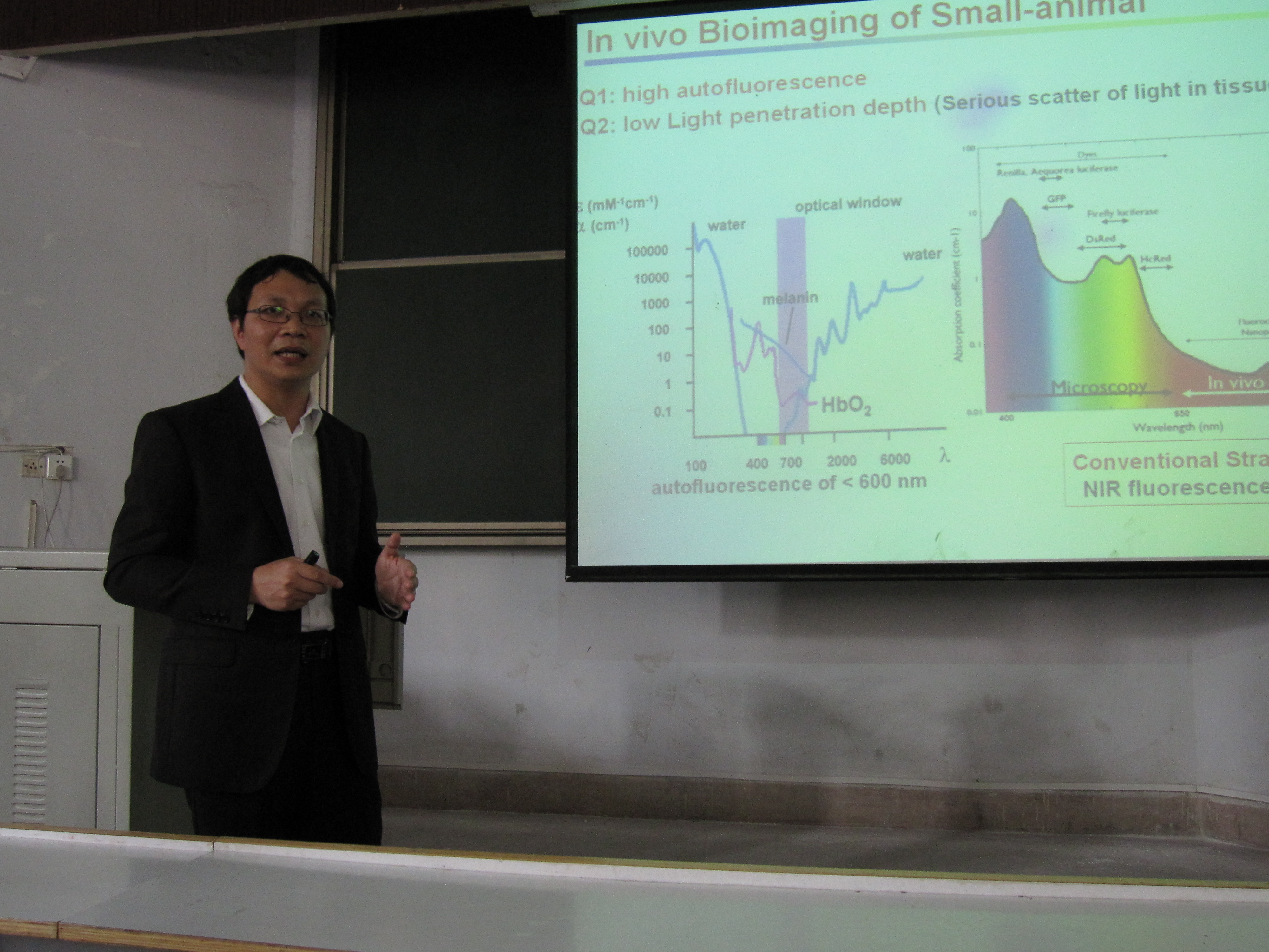 李富友教授首先介绍了什么是上转换发光材料,并从荧光探针和磷光配合物及其生物成像应用和上转换发光纳米材料及其生物医用两个方面了介绍了上转换发光材料的应用,接着对金属纳米材料和金属配合物两类上转换发光材料的优缺点进行了比较,最后介绍了一些上转换发光材料的生物应用存在的问题。李教授精彩的报告赢得了师生的阵阵掌声。会后,李富友教授与太阳集团tyc151cc师生就报告相关内容进行了深入交流。