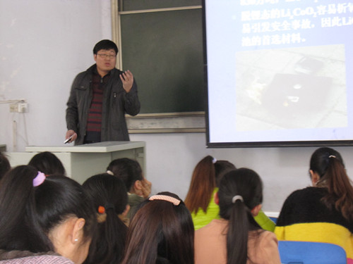 报告中,曹晓雨教授从石油、煤能源开始,讲到将来面临的能源危机,接着讲述了化学电源在能源中的地位及应用,根据化学电源的类型,阐述了各种电池特别是发展中新型电池在人们生活中的应用,并结合自己的科研实践,讲授了锂离子电池的研究进展。曹晓雨教授精彩的报告,赢得了台下观众的阵阵掌声。会后,曹教授与化院师生进行了亲切的交谈。