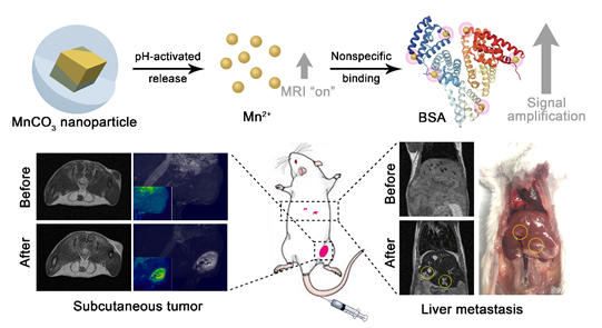 磁共振成像(magnetic resonance imaging, MRI)具有无电离辐射、非介入性、组织断层扫描等优点,在临床医学特别是癌症诊断中占据不可或缺的地位。但目前主流的MRI造影剂弛豫率低,且只能对肿瘤位置成像,无法给出恶性程度、转移等信息。朱祥龙和师赛鸽博士发展了一种基于MnCO3的纳米探针,通过对肿瘤微环境的智能响应以及蛋白质非特异性结合所带来的弛豫增强效应,实现了对肿瘤恶性程度、肝转移灶的灵敏诊断,肿瘤与正常组织的MRI对比度高达298%。该工作为智能响应型MRI造影剂的发展提供了研究思路。