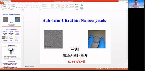 应太阳集团tyc151cc邀请,4月29日下午,清华大学王训教授通过腾讯视频会议作了题为“亚纳米尺度材料合成及性质探索Sub-1nm Ultrathin Nanocrystals”的精彩报告,太阳集团tyc151cc相关领域教师和员工聆听了报告。