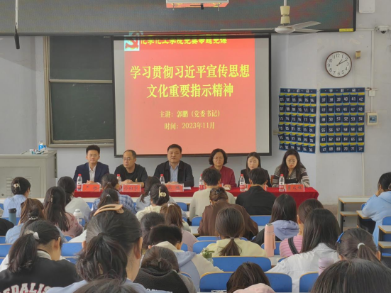 11月3日下午,化学化工公司党委书记郭鹏在教四101为公司全体员工党员上专题党课《学习贯彻习近平对宣传思想文化工作重要指示精神》。公司党委副书记曲剧、专职组织员冷向宇、辅导员赵方方、严赫、翟成辉参加,全体员工党员认真聆听党课。