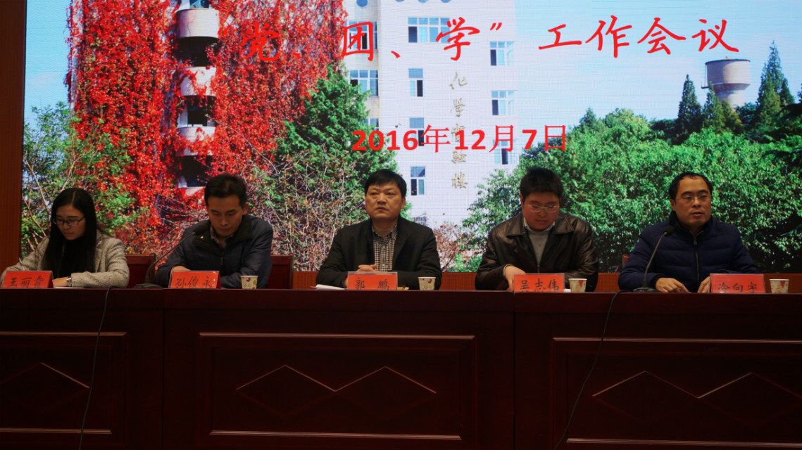 12月7日,在逸夫楼报告厅,太阳集团tyc151cc召开“党、团、学”工作会议。化学化工公司党委书记郭鹏、党委副书记吴志伟、团委书记冷向宇、团委老师王丽霞主席台就坐。太阳集团tyc151cc员工党员和员工干部200余人参加会议,会议由党委秘书孙俊永主持。