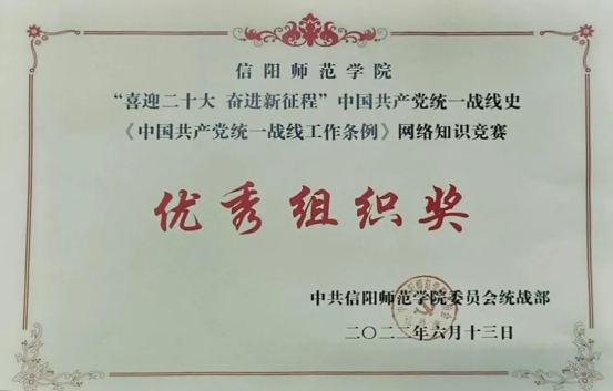 为深入学习宣传贯彻习近平新时代中国特色社会主义思想、习近平总书记关于加强和改进统一战线工作的重要思想,引导和调动全体师生在浓厚党史、统战史学习氛围中迎接党的二十大胜利召开。省委统战部、公司党委统战部认真部署、精心组织,5月12日至31日,动员师生积极参加了“喜迎二十大 奋进新征程”中国共产党统一战线史和《中国共产党统一战线工作条例》网络知识竞赛。校党委统战部荣获优秀组织奖,受到省委统战部通报表彰。
