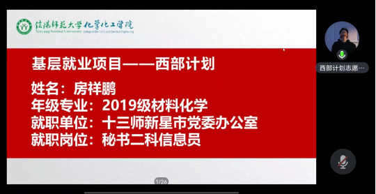 会上,李燕燕首先讲述自己为何选择西部计划,然后分享了自己如何成功入选和目前的岗位情况,最后对西部计划的政策进行解读,并结合自身的成长,呼吁同学们参与到祖国建设支援西部发展。随后,房祥鹏对西部计划再次进行了详细介绍,然后结合工作事例,分享了自己在新疆的所见所闻,把成长中的经验传授于同学们,并与同学亲切交流,详细回答同学们的问题,鼓励同学们,将个人理想信念同党和国家的事业相融合。会上,两位员工对同学们的提问进行一一解答。