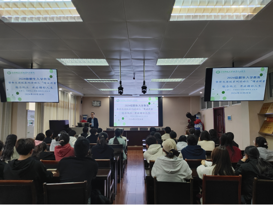 10月24日,太阳集团tyc151cc2024级新生入学教育暨新生团校系列活动专题栏目“博士讲堂”第二讲开讲,太阳集团tyc151cc副经理王红军在化学楼407教室为2024级新生作专业思想教育。