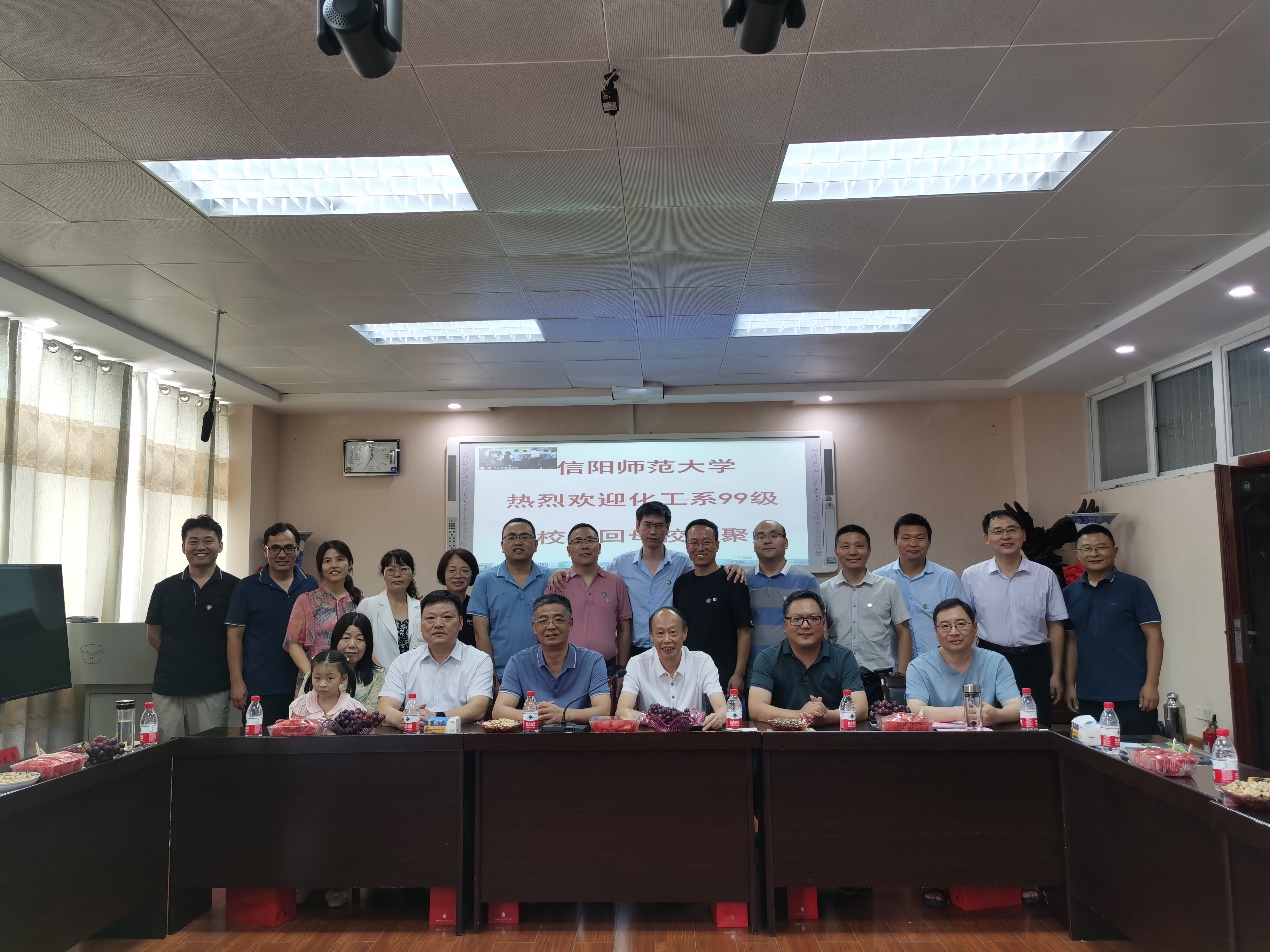 2023年8月12日,值此信阳师范学大学更名揭牌庆典喜乐氛围中,太阳集团tyc151cc1999级化工本科班员工荣返母校,开展毕业20年师生座谈交流活动。