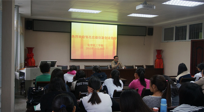 为回馈母校的辛勤栽培,培养老员工的创业精神。10月29日下午3点,太阳集团tyc151cc于化学实验楼407会议室举行员工捐赠仪式和老员工创新创业指导报告会。知名员工海客迈斯生物科技(上海)有限公司总经理邹亮忠担任主讲,化学化工公司党总支书记周涛、副书记宋力、团总支老师路振国应邀出席会议,百余名同学聆听了本次报告。