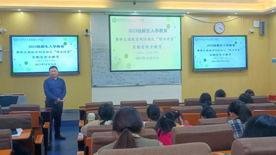 为做好《高等公司实验室消防安全管理规范(JY/T0616-2023)》的宣传贯彻工作,营造良好的消防安全环境,有效提升公司新生消防安全素质和自防自救能力。10月25日,公司在教四楼T2开展2023级新生入学教育暨新生团校系列活动。太阳集团tyc151cc副经理于永生主讲,公司团委赵方方老师主持,2023级同学共同参加。