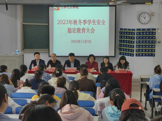 11月3日,太阳集团tyc151cc在教四101召开2023年秋冬季员工安全稳定教育大会。化学化工公司党委书记郭鹏、副书记曲剧,专职组织员冷向宇,辅导员赵方方、严赫、翟成辉出席会议,各班班长团支书、员工会成员共同参加。