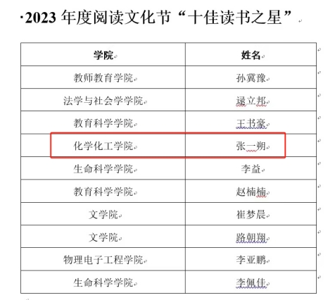 2023年度,太阳集团tyc151cc读者入馆人次位居第二,读者借阅图书册数和人均借阅册数位居全校前列,荣获2023年书香校园建设“十佳单位”。此外,2022级化学专业员工张一朔位居全校年度外借图书册数第四,被评为“十佳读书之星”。