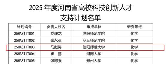 近日,河南省教育厅公布了2025年度河南省高校科技创新团队和创新人才立项名单(教科技〔2024〕354号文件),公司马献涛副教授入选2025年度河南省高校创新人才支持计划名单,获批科研资助经费30万元。