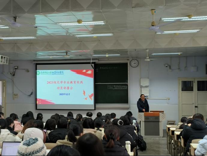 2025年12月23日,公司在教六101教室召开2023级化学专业教育实践工作动员部署会。公司副经理王红军出席会议并作动员部署,2023级化学专业全体200余名员工参加会议。会议旨在统一思想、明确任务,扎实推进教育实践环节,有效提升员工的教学实践能力与综合职业素养。
