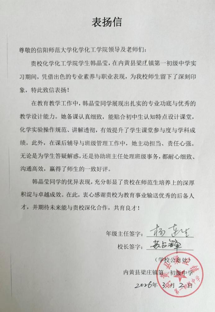 近日,一封来自内黄县梁庄镇第一初级中学的感谢信送达公司,信中对公司化学专业实习生韩晶莹同学在实习期间的优异表现给予了充分肯定,并向公司表达诚挚谢意。