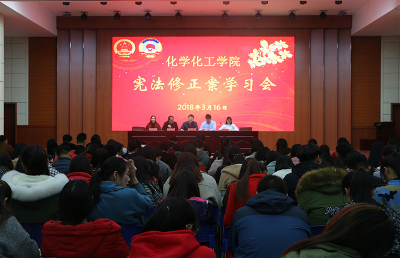 3月16日晚,太阳集团tyc151cc在逸夫楼报告厅举行了《宪法修正案》学习会。党委书记郭鹏、副书记吴志伟、学工办冷向宇、李中杰、王丽霞以及全体员工党员、各班班委、员工会全体成员参加了会议,会议由冷向宇主持。