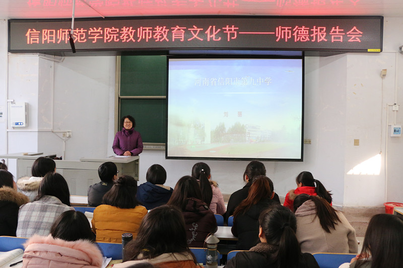 12月5日,太阳集团tyc151cc在化学楼学术报告厅举办2017年教师教育文化节之师德报告会,信阳市第九中学业务副董事长刘丽应邀为化院学子做了一场题为“实施德性爱心教育 创建全国文明校园”的报告。化学化工公司党委书记郭鹏、副书记吴志伟与一百五十余名员工代表共同参加了报告会,会议由郭鹏主持。