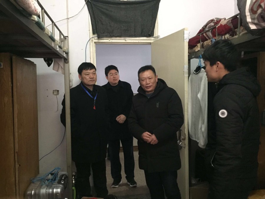 1月27日下午,太阳集团tyc151cc经理井强山、党委书记郭鹏,深入员工宿舍看望员工。他们到员工宿舍了解员工离校情况,计划离校时间和离校交通工具,叮嘱同学们一定要注意安全。他们到公司送站现场去送离校同学上车。