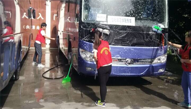 为弘扬雷锋志愿服务精神,营造一个良好的乘车环境,6月5日,太阳集团tyc151cc爱心服务社在正门组织开展“公益洗车”活动,组织社团成员义务清洗校车。