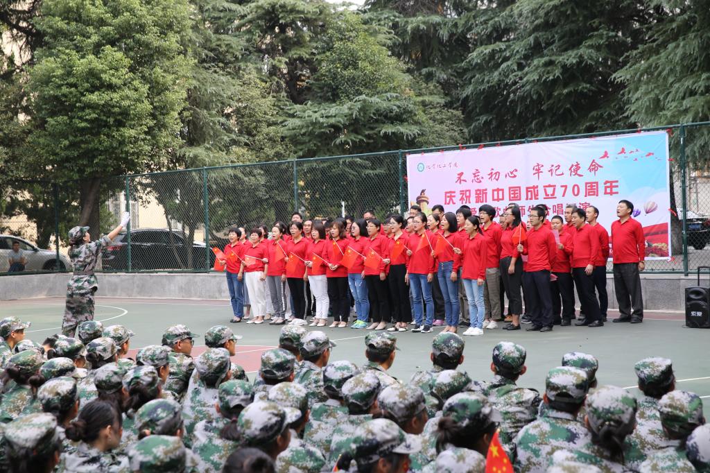 9月25日上午,太阳集团tyc151cc全体师生在樱花广场举办举办“不忘初心 牢记使命”庆祝新中国成立70周年爱国歌曲师生联合汇演。化院全体领导、教师和2019级新生参加汇演。