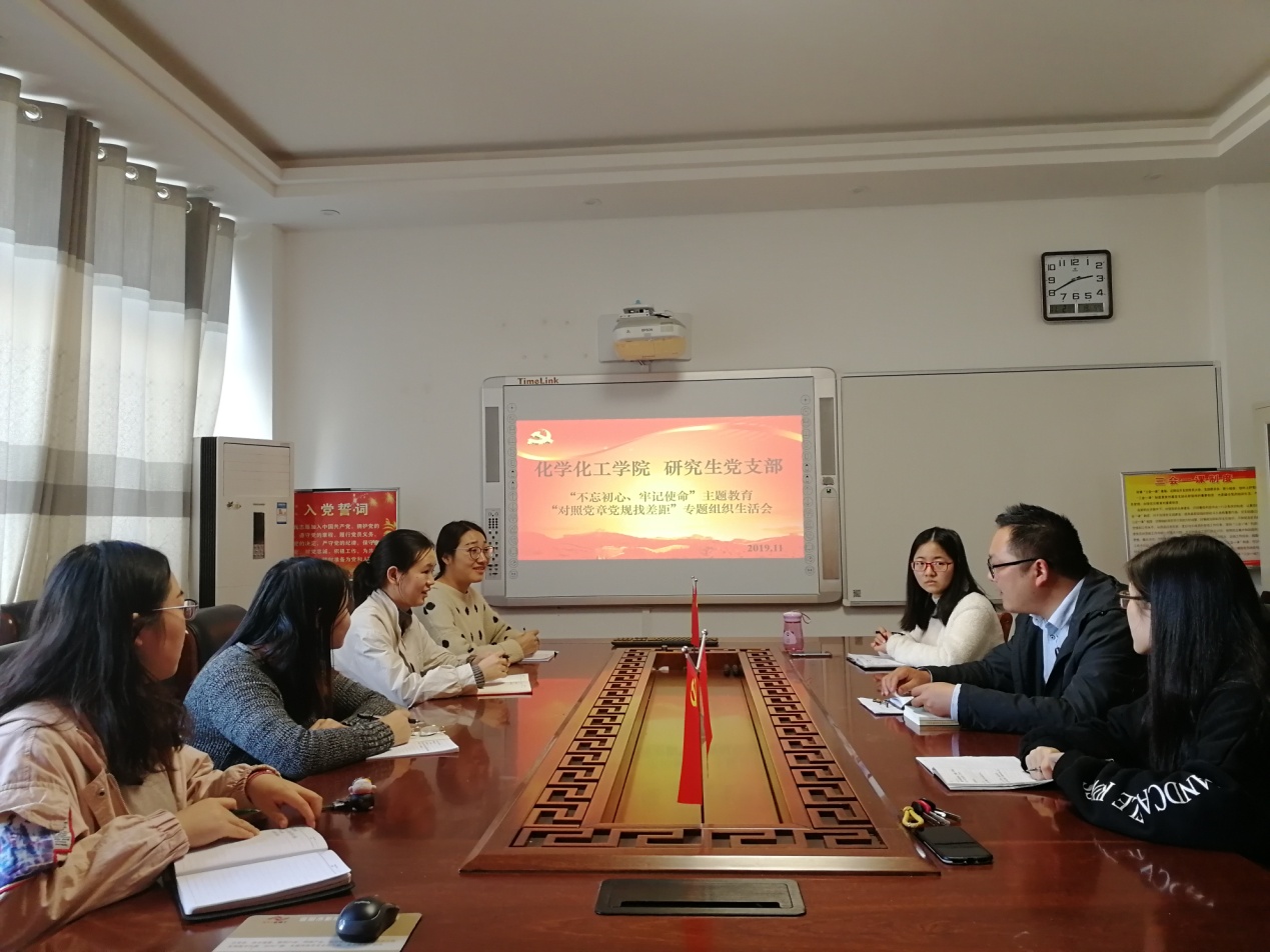 11月1日下午,太阳集团tyc151cc研究生支部在化学楼313会议室召开“不忘初心、牢记使命”主题教育对照党章党规找差距改专题组织生活会,研究生支部党员参加了会议,会议由支部书记曹俊涛同志主持。