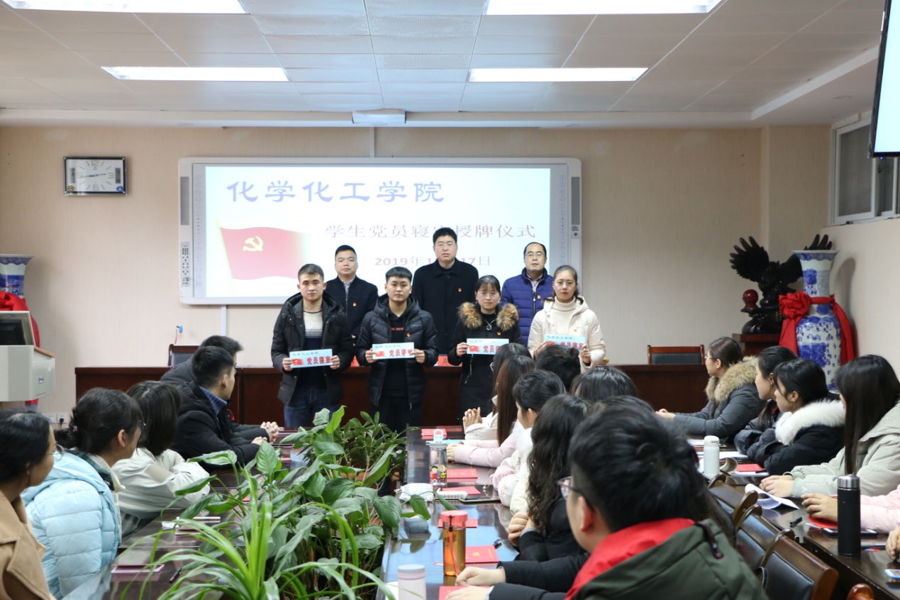 会上,吴志伟、冷向宇、邓耀辉向新入党党员代表发放党徽,为员工党员寝室授牌。