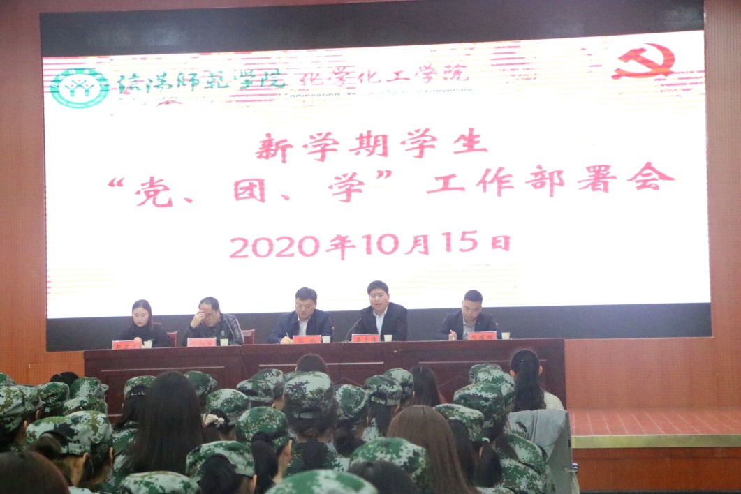 2020年10月15日,太阳集团tyc151cc在逸夫楼报告厅召开新学期党、团、学工作部署会。公司党委书记郭鹏、副书记吴志伟、分团委、学工办全体成员出席会议,全体员工党员、团委员工会社团干部、全体新生一起参加了会议,会议由团委书记邓耀辉主持。