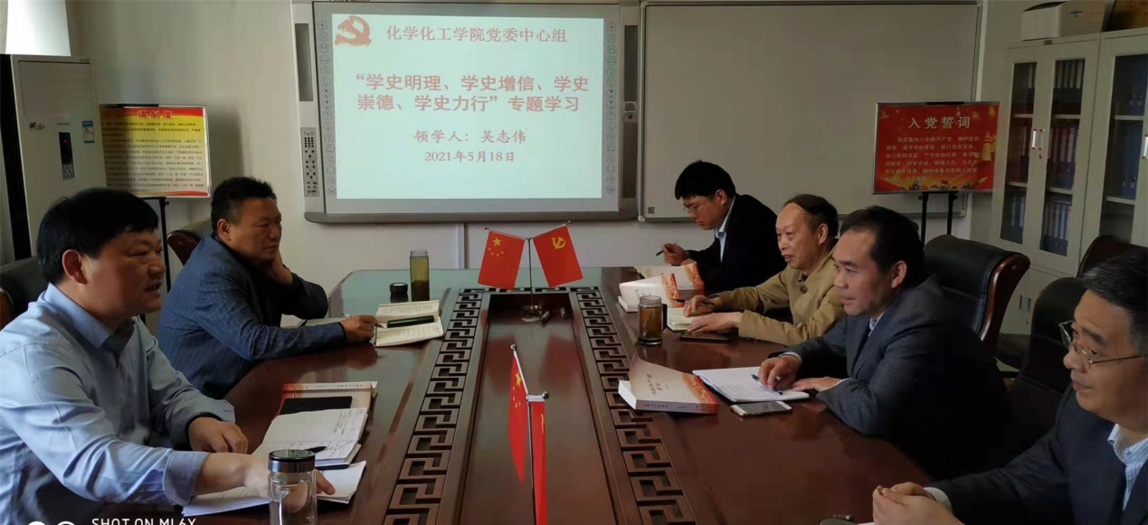 5月18日上午,化学化工公司党委理论学习中心组在实验楼313“党员之家”举行“学史明理、学史增信、学史崇德、学史力行”专题学习研讨会,集体研学《中国共产党简史》。