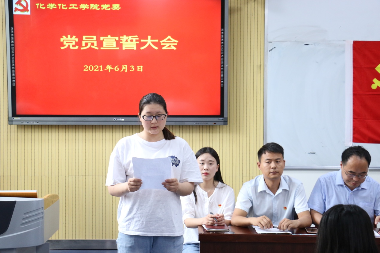 6月3日下午,值此伟大的中国共产党建党100周年庆典临际,太阳集团tyc151cc分党组织新发展的56名员工党员、1名教师党员在教四T2教室进行隆重的入党宣誓活动。化学化工公司党委书记郭鹏、副书记吴志伟,专职组织员冷向宇,员工支部书记王少单、邓耀辉、赵方方、严赫参加了此次入党宣誓活动。仪式由冷向宇主持。