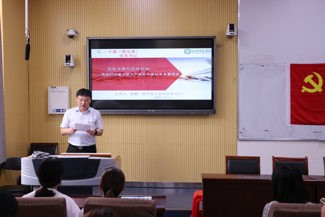 6月3日下午,公司党委书记郭鹏为员工党员讲授了《百年大党与百年巨变》“党史学习教育”之七•一专题党课。在此次微党课报告上,郭鹏围绕“中国共产党与中国社会发展进步”,从历史与现实、国内与国外、理论与实践、基层的体会等几个维度进行了深入浅出地讲解。他表示,在中国共产党的领导下,党员同志要更清楚地把握“百年未有之变革”进程中中国大发展,特别是抗疫中大国担当、东西两种意识形态的持久对抗、以儒家文化为代表的东方治理模式、世界多极发展等方面的“变”化要素,厘清全球化大势、亚太区域发展重要性、中国和平崛起、新工业革命浪潮、中国发展巨变等方面。他强调,抗疫斗争充分彰显了新时代以习近平同志为核心的党中央驾驭复杂面的高超水平和担当,充分彰显了中国共产党的领导、中国特色社会主义制度的巨大优越性。他希望,全体党员要更加坚定对马克思主义中国化、中国共产党领导、中国特色社会主义道路的政治认同、理论认同、情感认同,将“小我”积极融入“大我”之中,以知识分子的家国情怀,以党员的初心使命,积极投身中国特色社会主义伟大实践,为奋力实现“两个一百年”的奋斗目标和中华民族伟大复兴的中国梦贡献智慧和力量。
