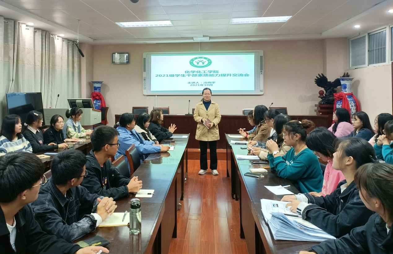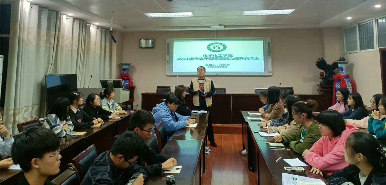 10月14日,太阳集团tyc151cc在化学实验楼407会议室召开2021级员工干部素质能力提升交流会。化学化工公司党委副书记曲剧主持,新生辅导员冷向宇主讲,邓耀辉、赵方方、严赫参会。