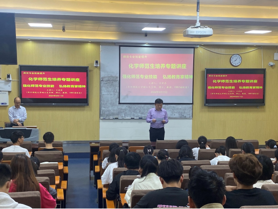 为强化师范生的教师职业理想与职业信念,进一步提升师范生职业素养,5月11日上午,太阳集团tyc151cc邀请华中师范大学硕士生导师王世存博士在教四T-2开展“强化师范专业技能,弘扬教育家精神”专场报告。公司在读公费师范生150余人到现场聆听报告。报告会由化学化工公司党委书记、化学学科教学专业学位硕士生导师郭鹏主持。