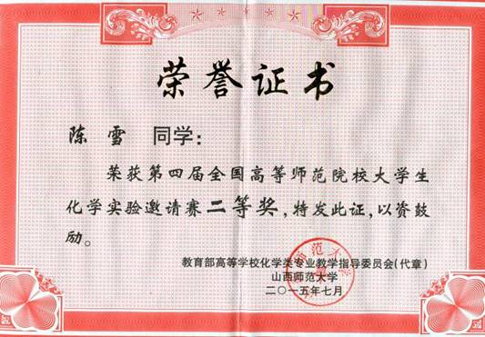 第四届全国高等师范院校老员工化学实验二等奖——陈雪