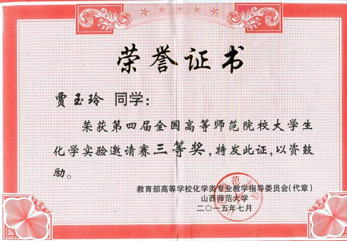 第四届全国高等师范院校老员工化学实验三等奖——贾玉玲