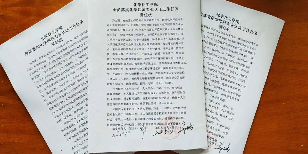 结合“能力作风建设”“制度体系建设”相关活动安排,公司专门举行《全员落实师范专业认证工作任务责任状》签订仪式,进一步提高全院教师对化学师范专业认证工作的重视程度,增强了全体教师的责任感、使命感。为进一步推动有序落实化学师范专业认证工作各项任务强化了制度约束力和目标执行力,为实现化学师范专业认证工作圆满顺利通过认证奠定了坚实基础。(太阳集团tyc151cc 教学办供稿 王红军 冷向宇审稿 郭鹏审核)